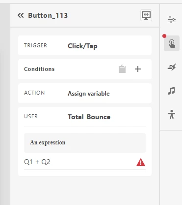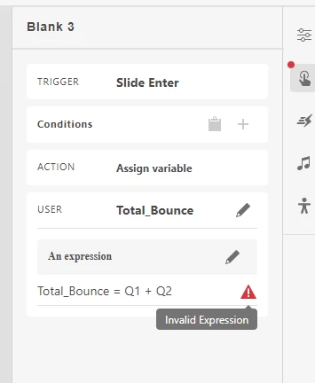 I need help with what would be a fairly straightforward Advanced Action in the old Captivate, but expressions do NOT quite display the same in Captivate 12. I have been unable to find any information about expressions beyond, you can add an expression in Captivate 12 using Assign Variable. Indeed, the option to add an expression is THERE, but no longer has operators (+, -, /, *) in drop-down menus, just a blank line. I have tried everything I can think of for this simple calculation, including learning more about JavaScript, but it shouldn't be that hard!! I want to add two variables to get a total on another variable: Total_Bounce = Q1 + Q2.