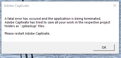 As the subject says, I get a fatal error everytime I click on the plus sign to add closed captioning (CC) and/or slide notes. I select the section of audio for which I want to add the CC, click the plus, and POW! Fatal error everytime. I've tried this on multiple projects. I even created a new blank project, added an audio clip, and attempted to add CC to no avail. I'm using version 11.5.0.476. Trying to get our admins to update to the latest version to see if this will fix it, but I doubt it as I cannot find anyone with a similar post. Any help would be appreciated.