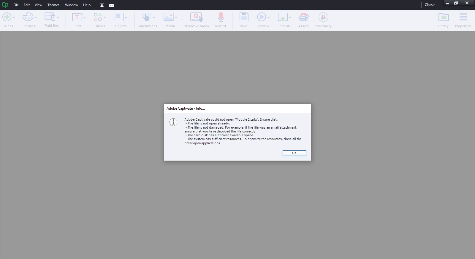 What version of Captivate are you using? (Please give both the major AND minor version numbers. You can find that information in Captivate under the Help > About Adobe Captivate menu item.)