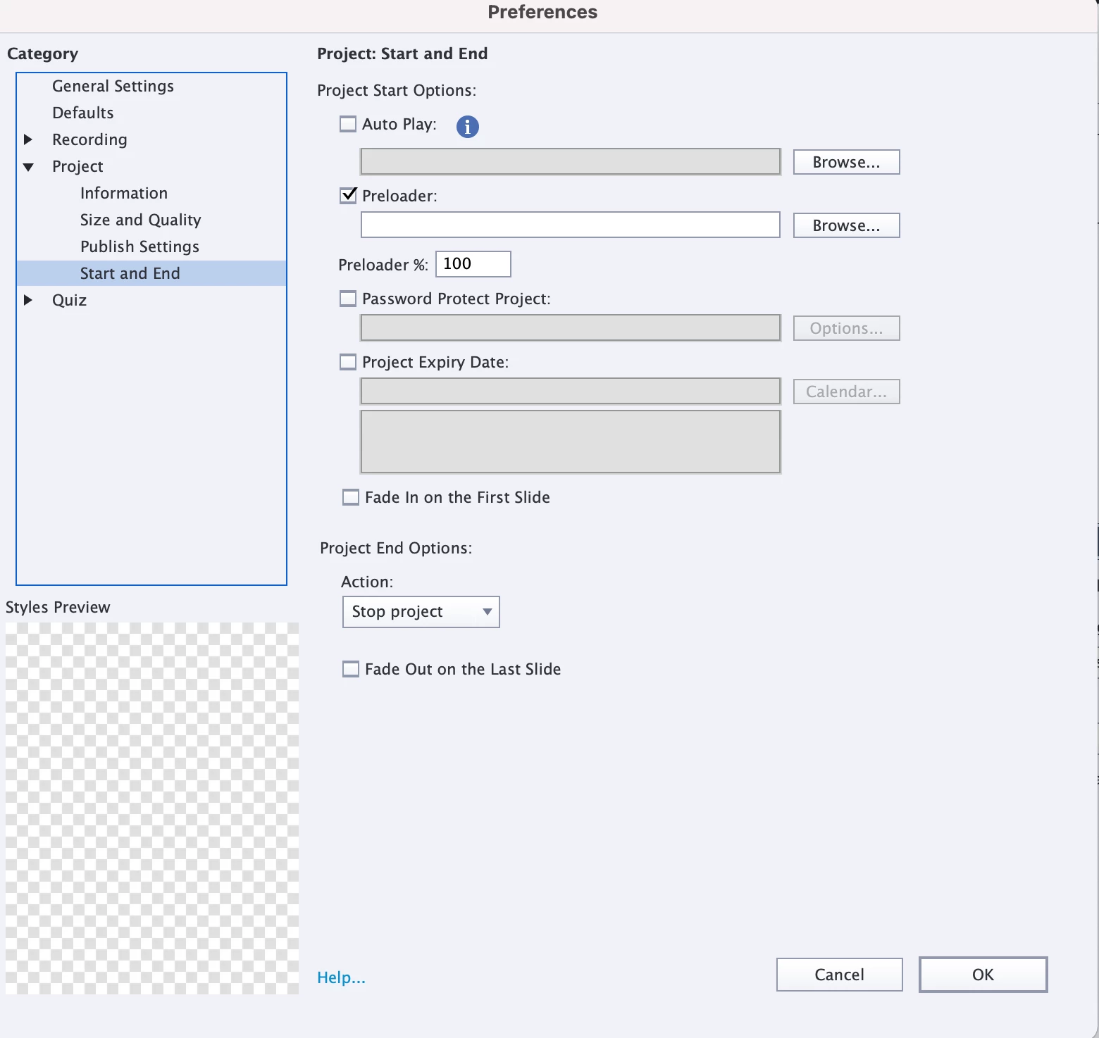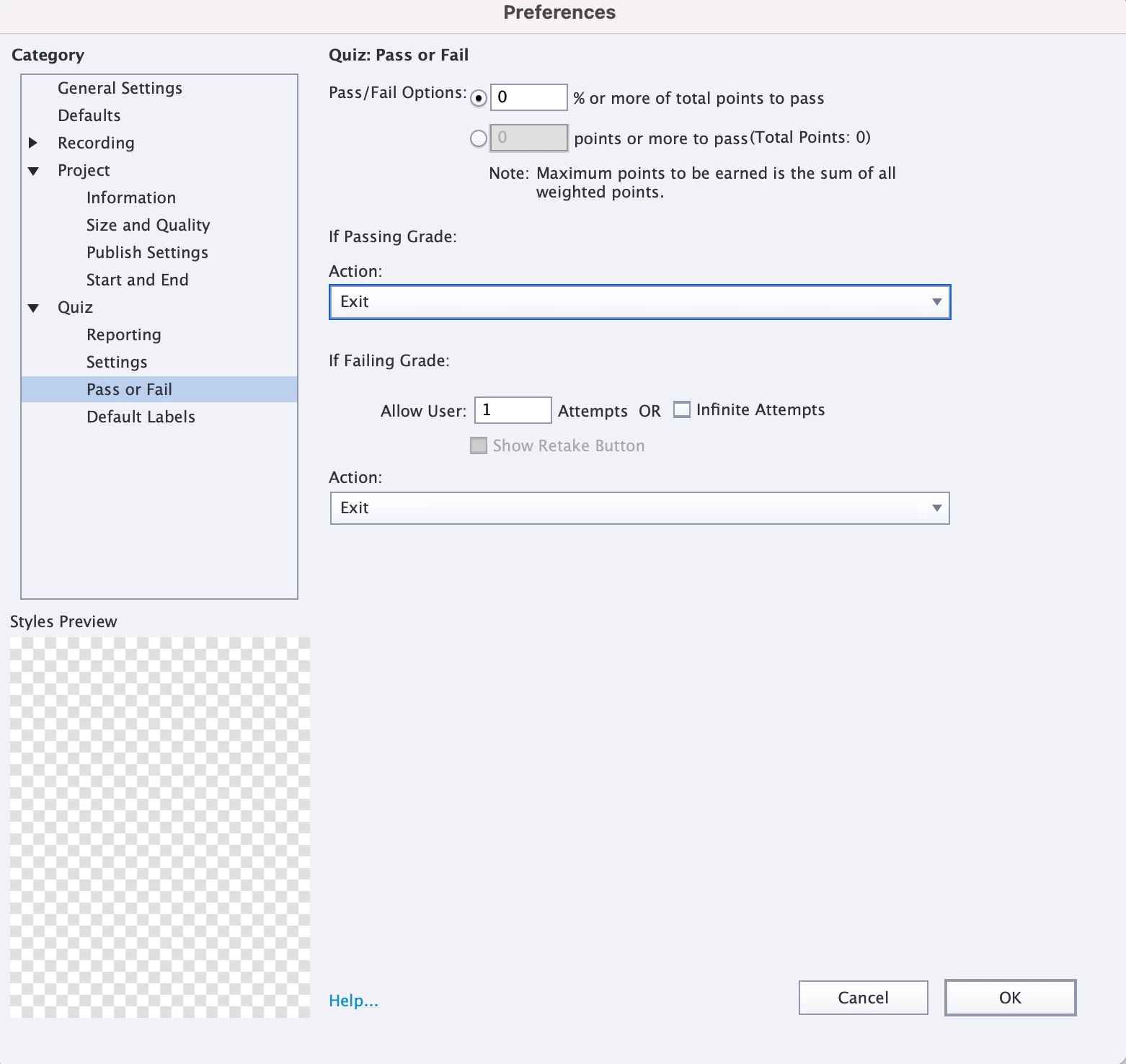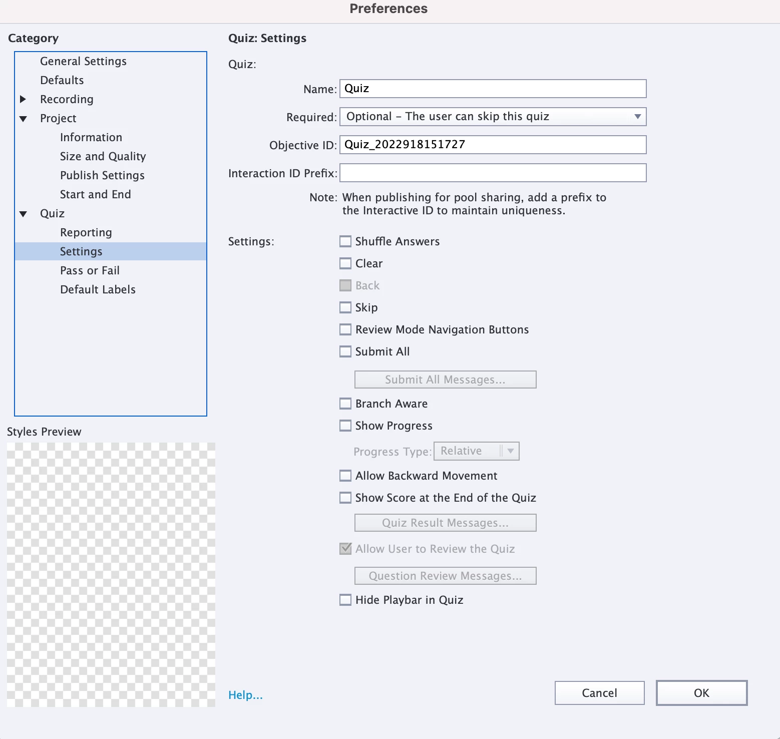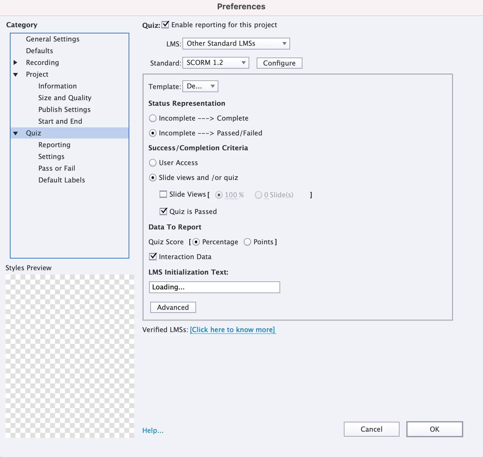 Current Adobe Captivate 2019 publish settings are included below. We do not have a quiz in the SCORM, but Talent LMS advised us to set up the success / completion criteria this way.