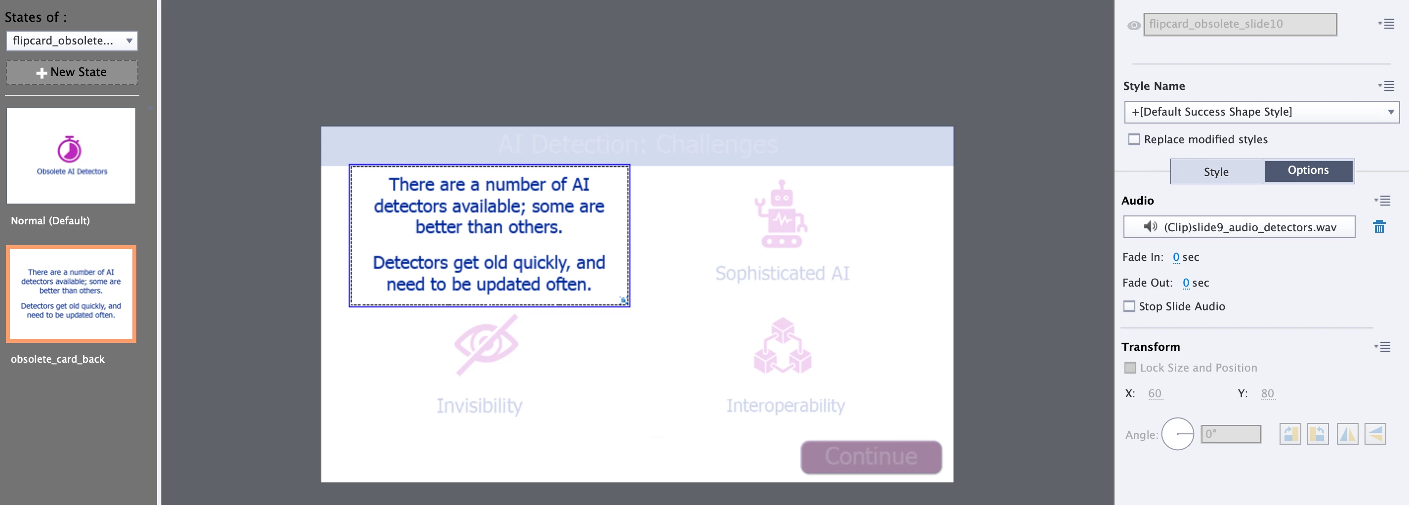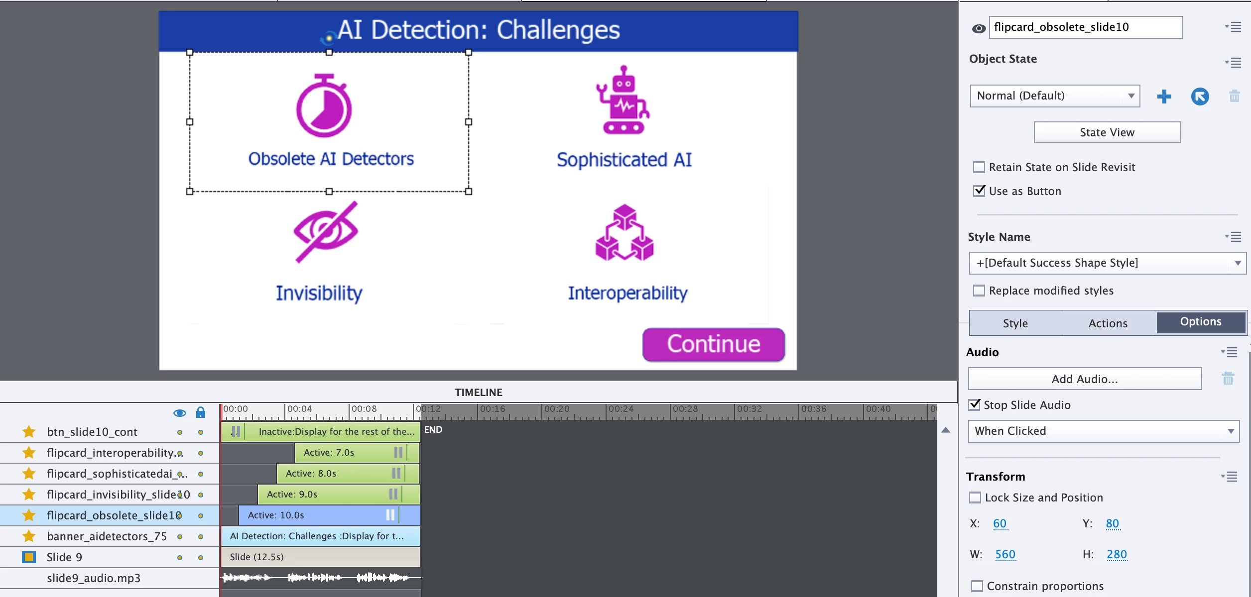 I have a slide with four flip cards on it, with audio attached to the 'card back' state. The slide has intro audio, and each card is set to stop slide audio on click. That works just fine (as does the flip action of the cards).