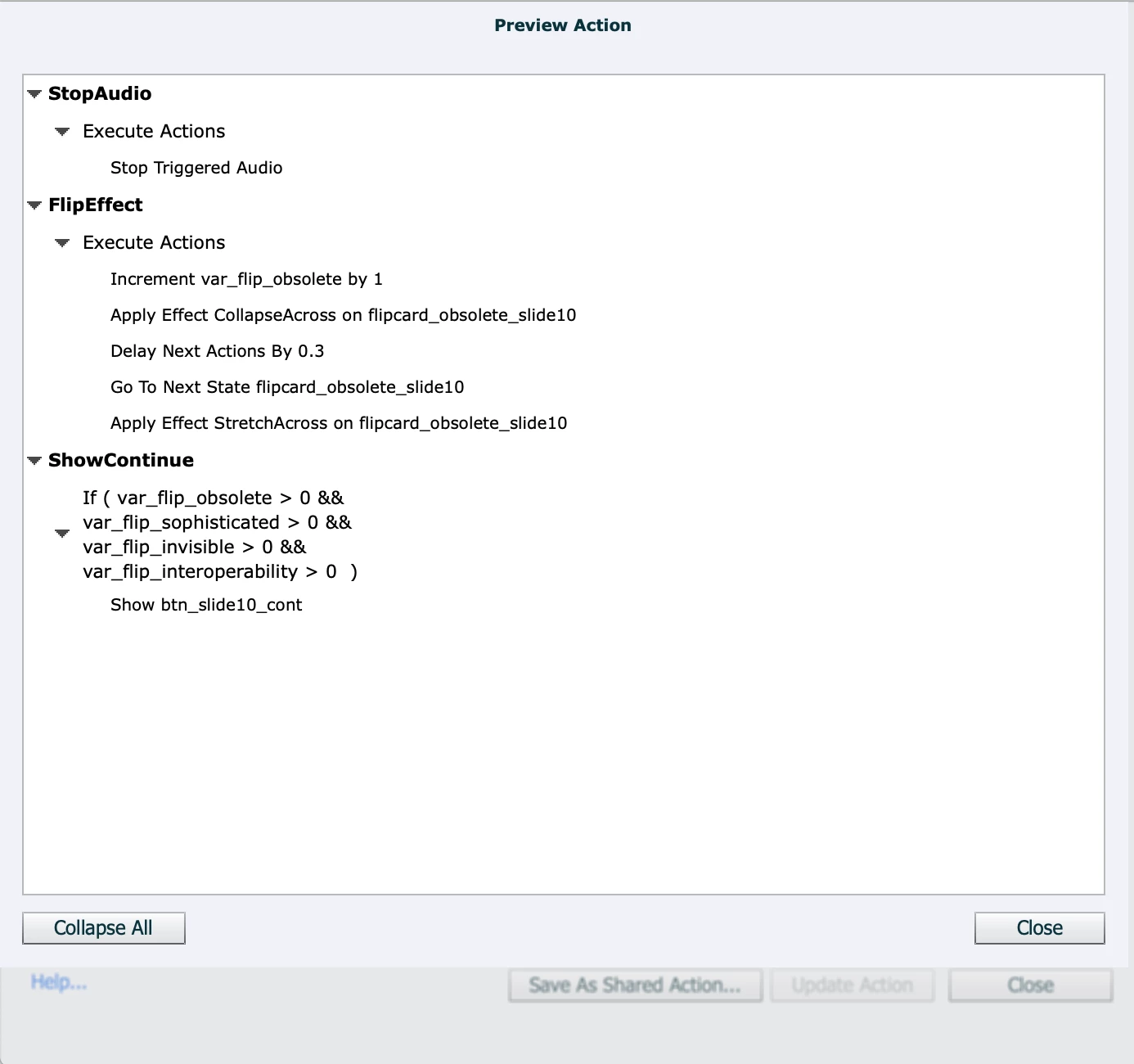 I have tried adding Stop Triggered Audio to each of the advanced actions written for the flip cards, but I can't get it to work. I've put it in different parts of the sequence thinking it needs to happen before other things, but nothing helped. I've separated it as its own decision within the advanced action, but that didn't help either.