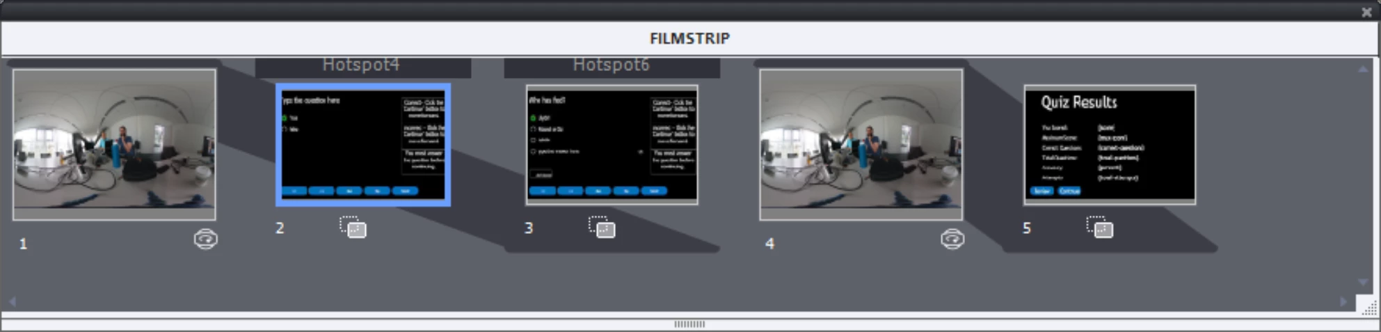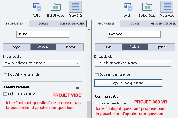Je travaille sur un projet qui n'est pas un projet 360 VR. J'ai quand même créé un slide avec de la 360 VR mais je rencontre un problème avec le "hotspot question". En effet, lorsque le projet n'est pas un projet 360 VR, le "hotspot question" semble ne pas proposer l'option qui permet de créer une question.