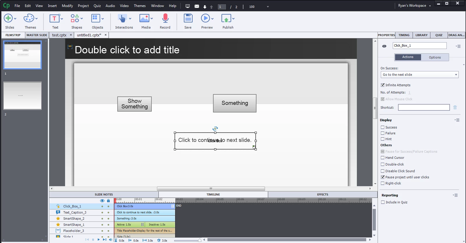 Problem : I have a smart shape-button and a click box on a slide. The user should be forced to click on the click box to go to the next slide. I checkmarked "pause project till user clicks" in an attempt to get this happen. But this is misleading because the user can still "override" this by clicking on other interactive objects. I don't think this is new to anyone. For example, if he clicks twice on "show something" he will advance to the next slide. Why does this happen? Is it because once the initial action is executed, the next action is always "continue"? So probably the age-old question: how do you keep certain interactive objects from breaking the "pause fence" created by others?