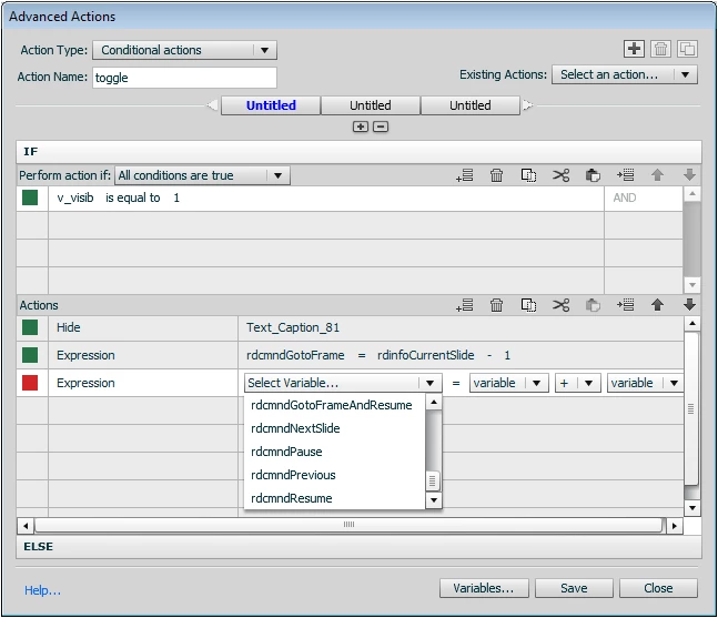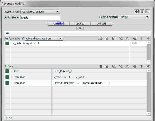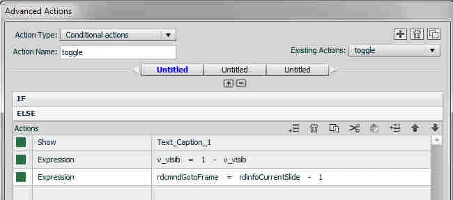 What is the best method to create a button that will hide / show a particular caption? I looked into using an advanced action, but have not been successful in indicating the correct variable / control statement to make it work.