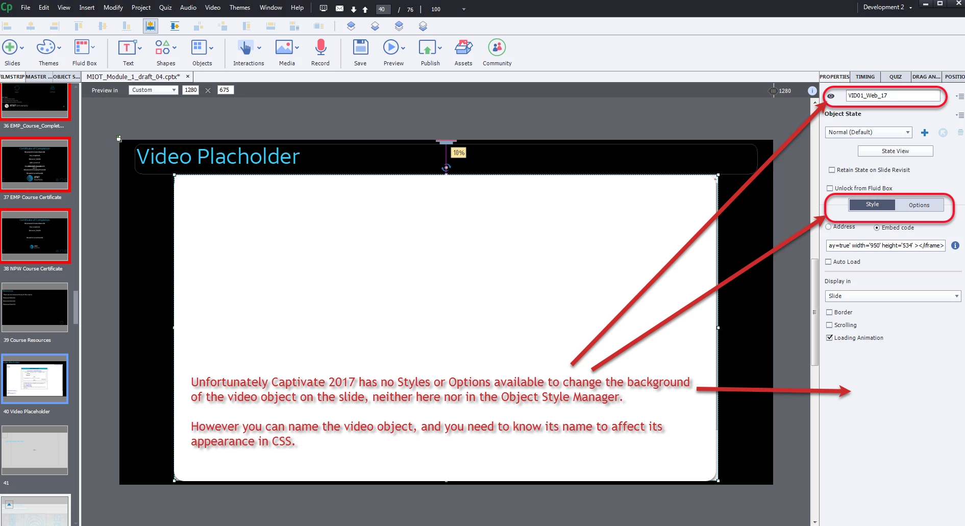 The video object has limited style and option editing in the properties panel. When I publish the course I get a slide with a big white box on it and a play button. Note that the play button is the same one that you get at the beginning of the course, as discussed here > Remove The Play button & White Screen that shows on mobile Adobe Captivate 2017