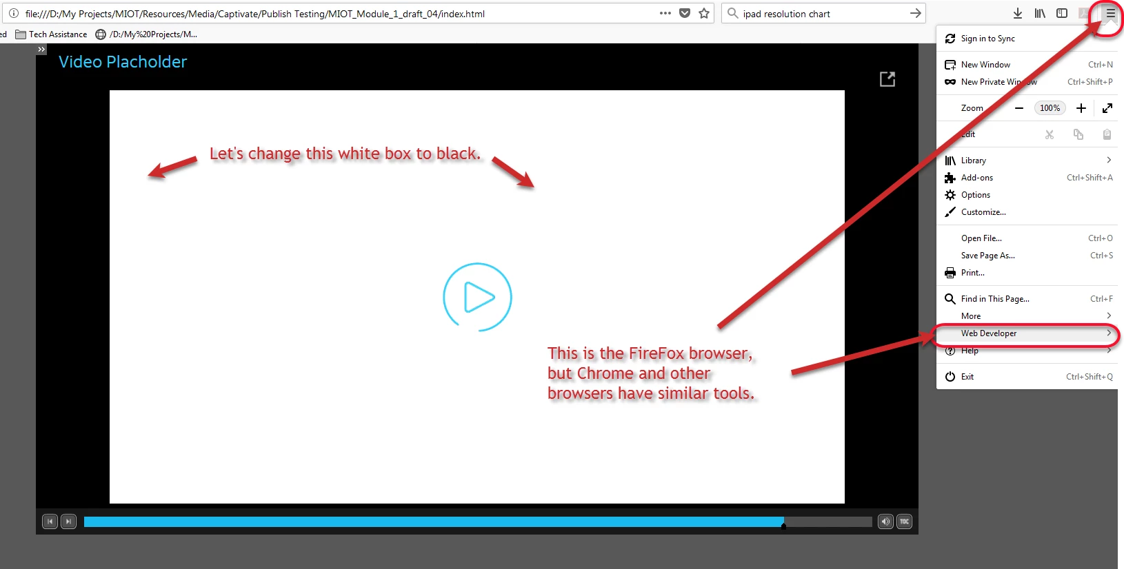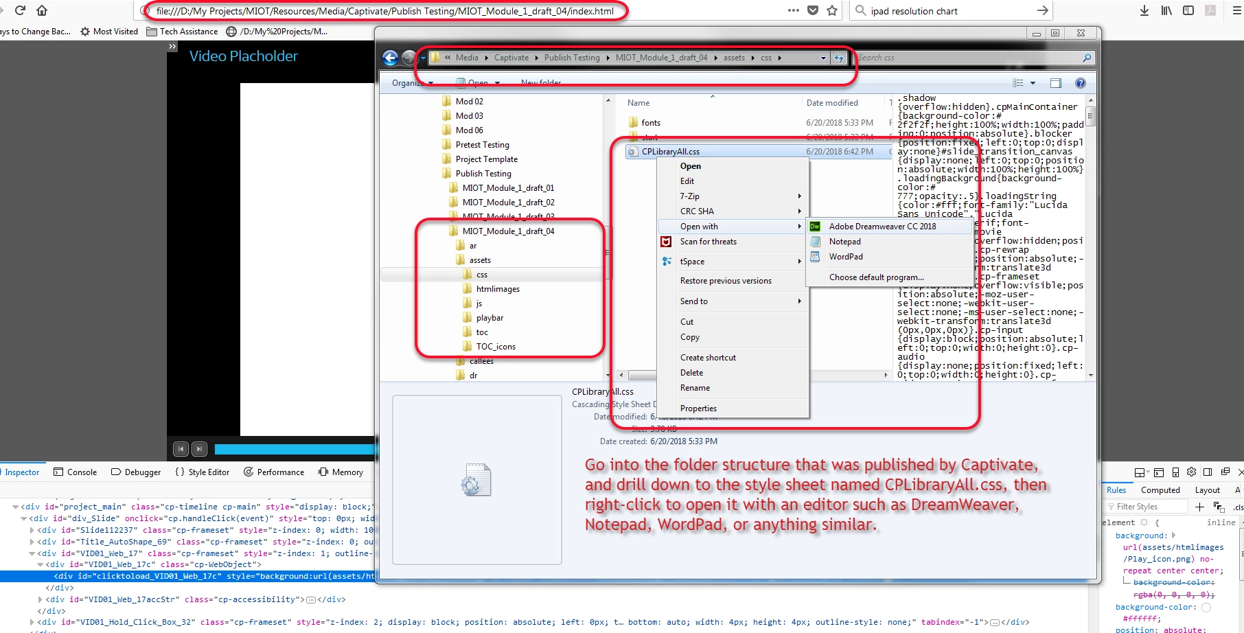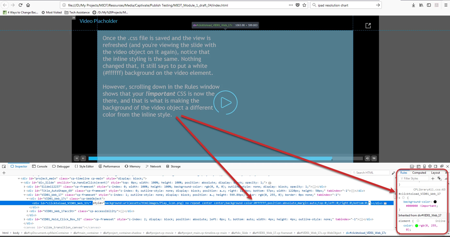 Use File > Save or Ctrl + S to save the CPLibraryAll.css file. Once it is saved the browser should obey it, so refresh your view in the browser and go back to your slide with the video on it.