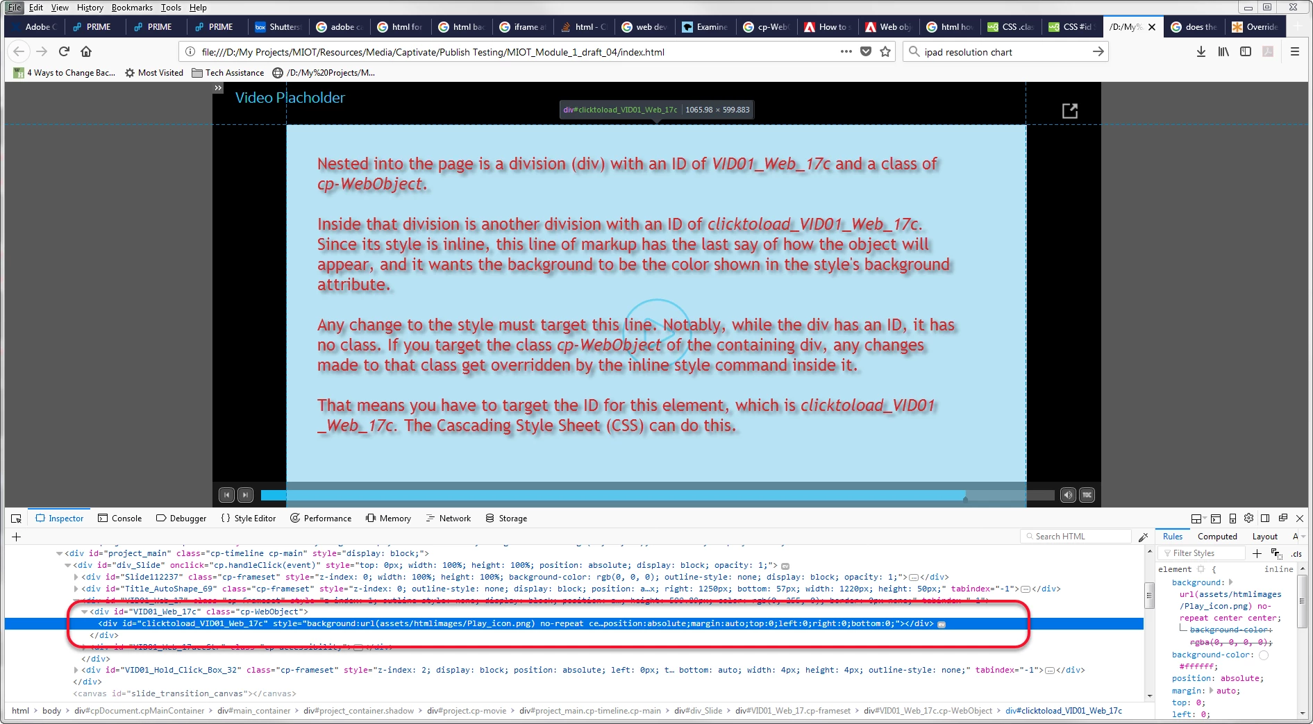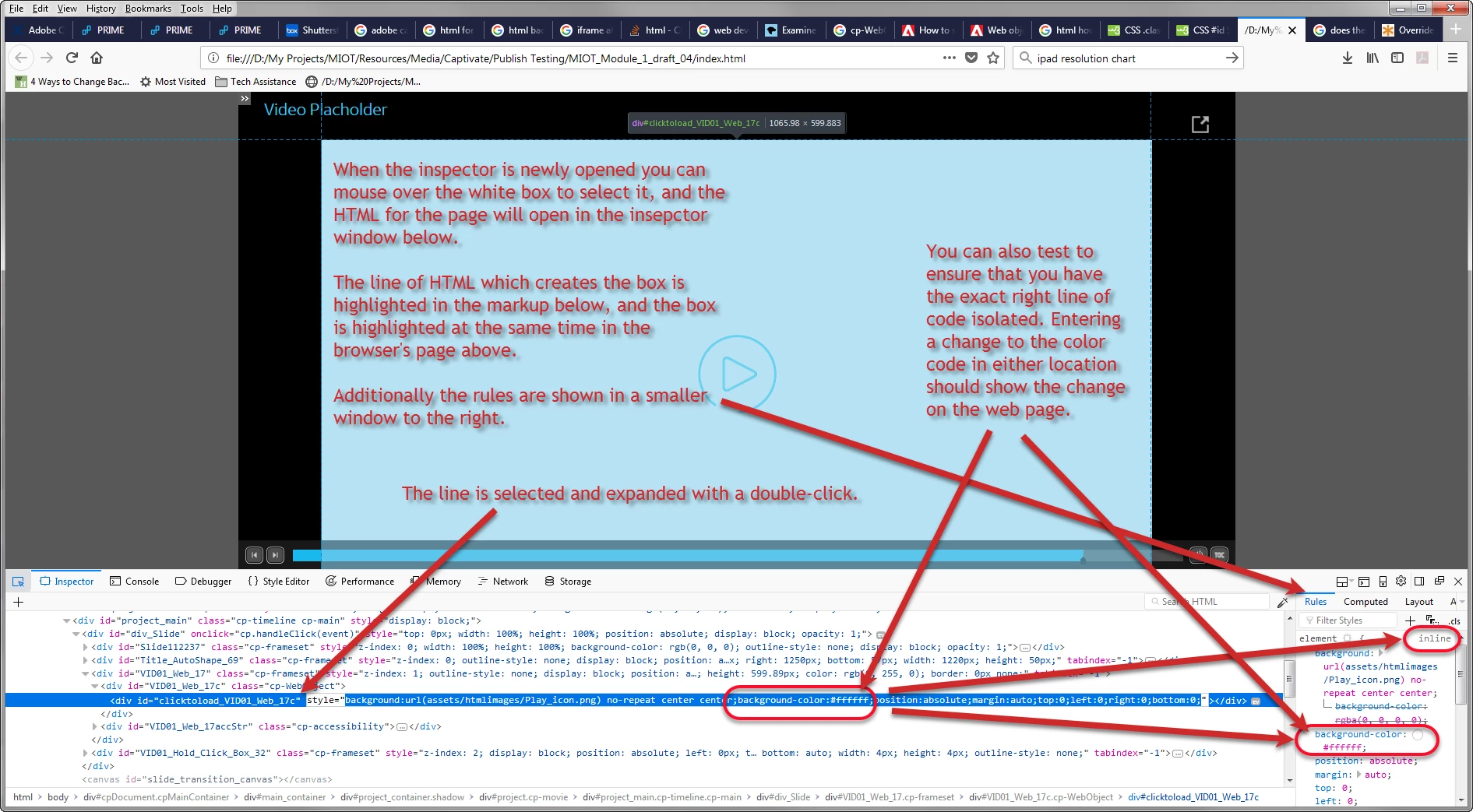 Somewhere in Captivate’s bowels is something that says “any time you create a video player on a page create a div for it, name that div clicktoload_whatever, and then make its background color #ffffff (white).” That’s the instruction we want to change, but can’t through Captivate’s interface.