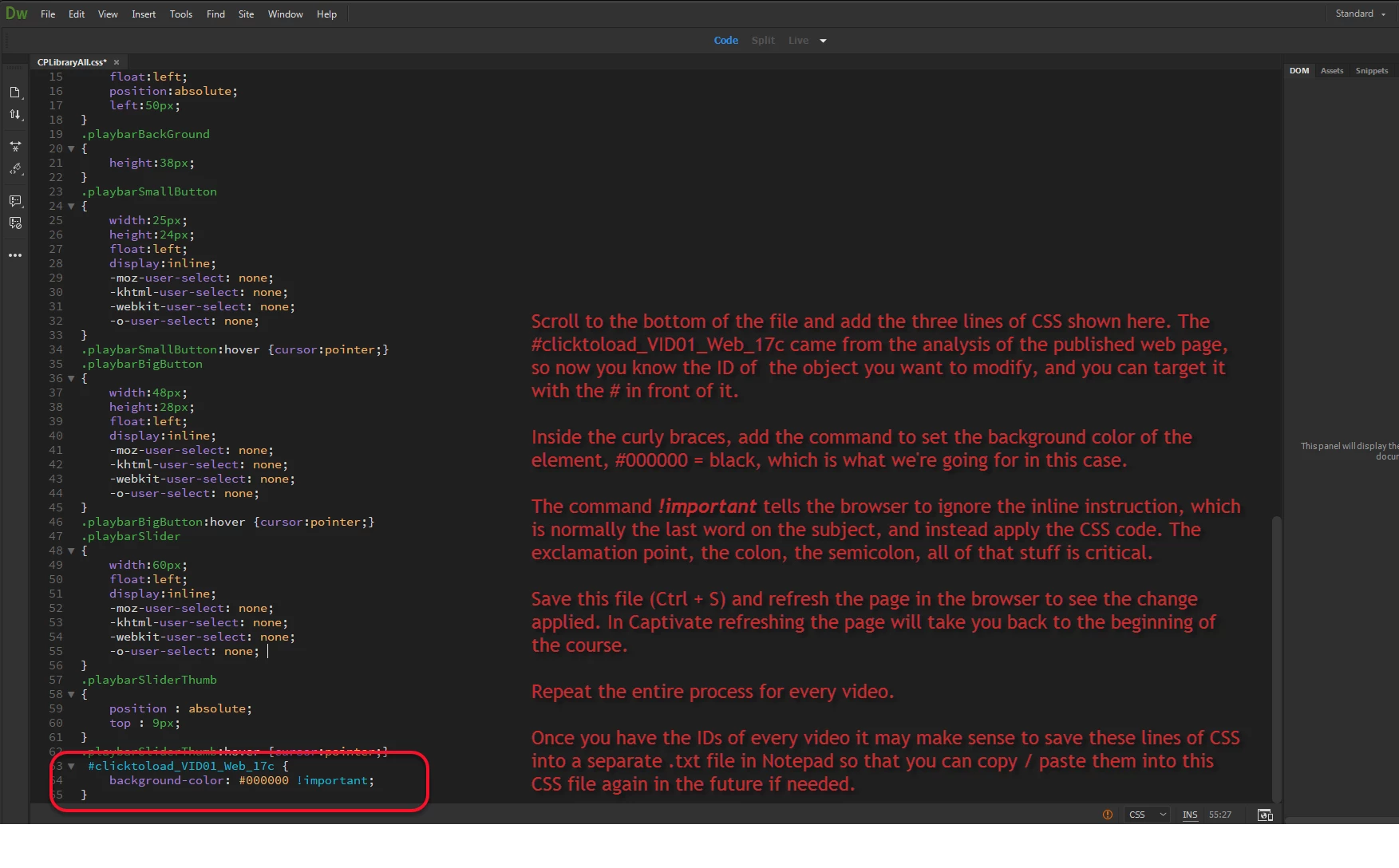 You can change that inline background-color command with CSS by use of the !important modifier in the CSS, however since Captivate puts the video into a div with an ID, but not a Class, you can only target the ID. There is a class (cp-WebObject), but that’s one division up, it’s not this division. If you target that class the browser will obey and do whatever you ask it to, but the next line says to set the background color to white, and the browser also obeys that command. This is why you’ll have to perform the steps below for every ID that you want to change the background color of, i.e. every video object in the course. If the video objects were classified at this level you could get them all in one shot.