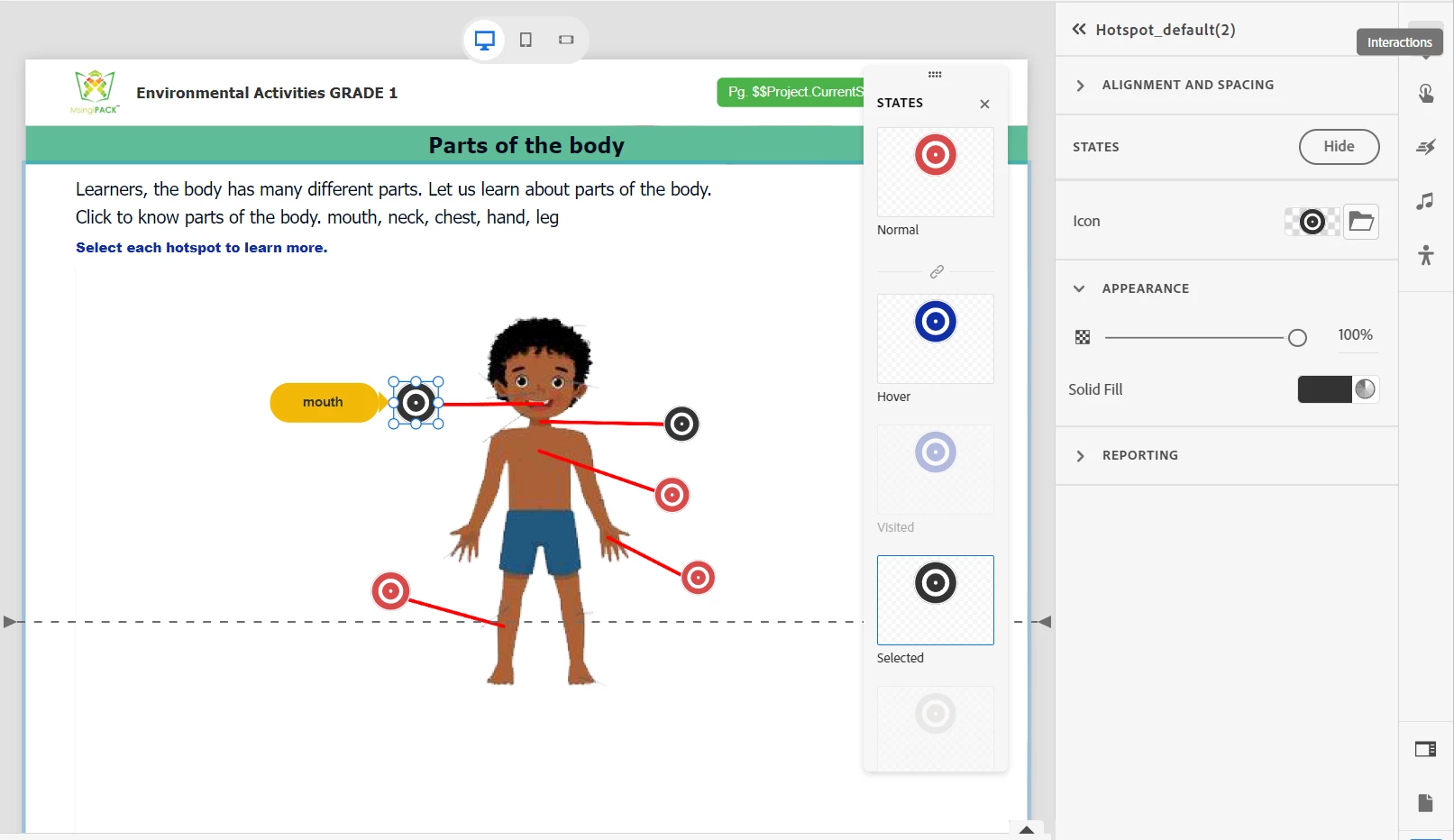 hotspots cannot trigger audio when clicked. for example parts of the body. When user clicks or hovers over the hotspot, they should be able to hear the name of that part. we can have an interaction like play media for each hotspot or embedd the audio in the callout. The same can be done for all widgets and carousels. they currently have no ability to play audio