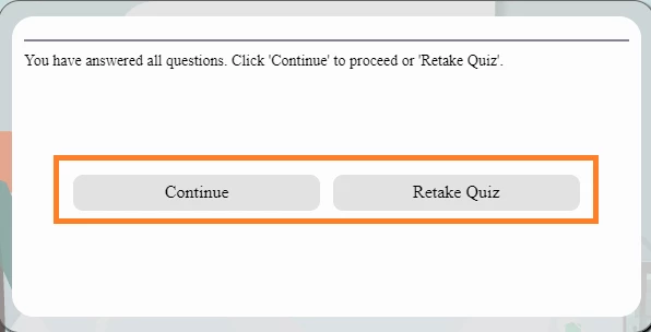 I have created a set of quiz with 'Submit All' option. The below Captivate dynamic window is appearing after the last quiz attempted. My question is how to enable the accessbility for the captivate dynamic window so that learner can use TAB and SPACE keys to select the 'Continue' or 'Retake Quiz' buttons in the dynamic window.