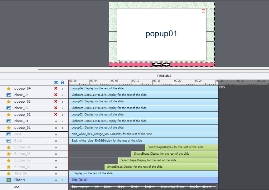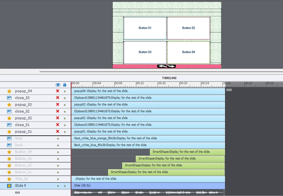 1) There are 4 buttons on the main slide, and the 4 buttons have 4 pop ups with 4 close buttons on the same main slide.