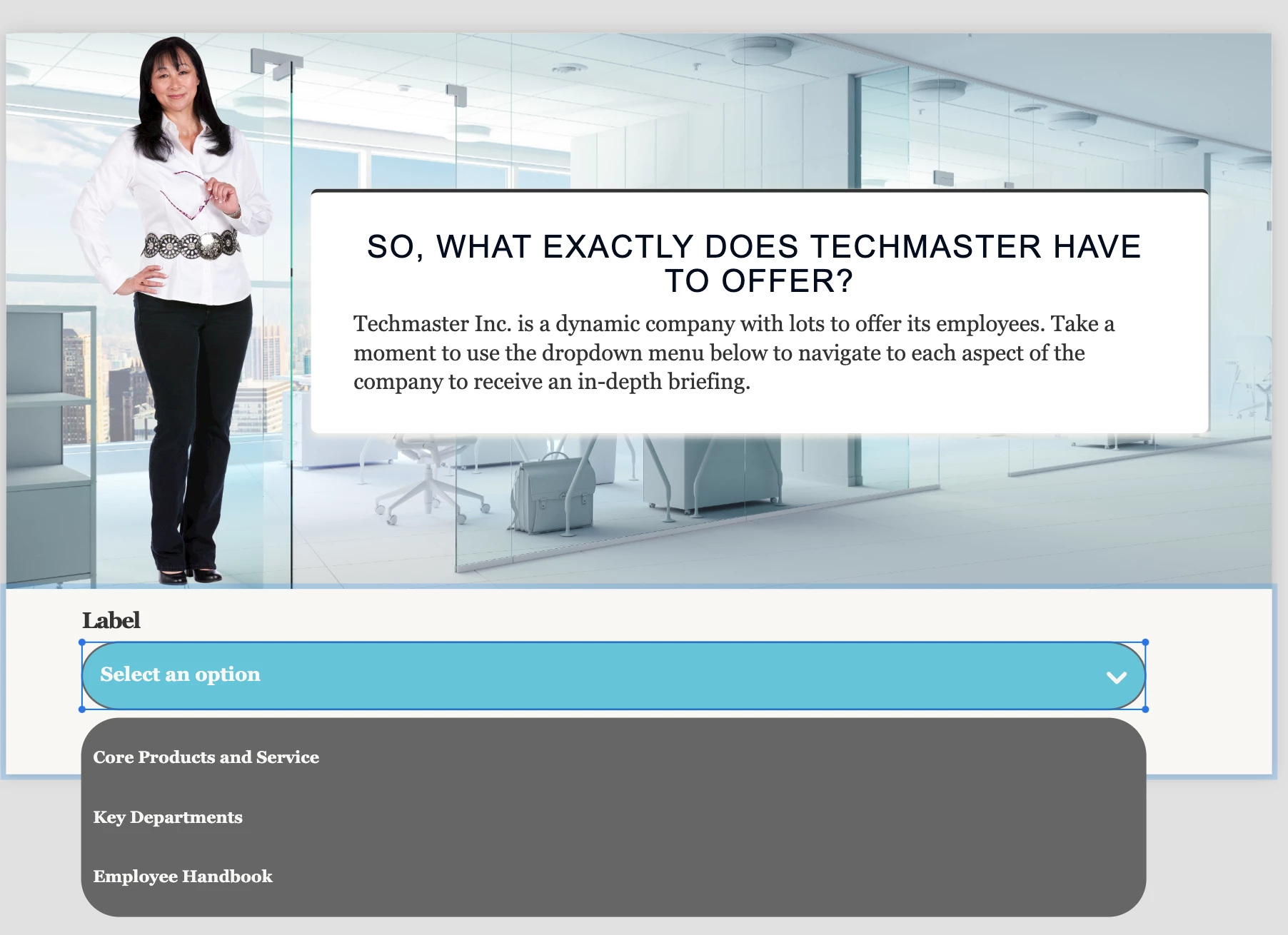 Hi! I am using the new Adobe Captivate. I am new to Adobe Captivate, so I am still learning. I have a slide that includes a dropdown menu. I would like to hide the button upon entry on a slide until the user visits each drop-down item, and then it appears for them to move on to the next slide. Can someone help me with this? If you can add screenshots, that would be extremely helpful. If not, I am a quick study, and I believe I will be able to learn without the screenshots.