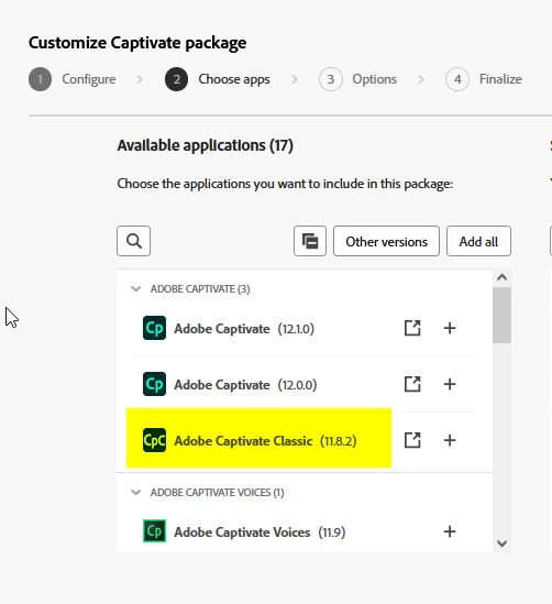 4. From the customize window , cick on other versions , Captivate Classic will be visible.