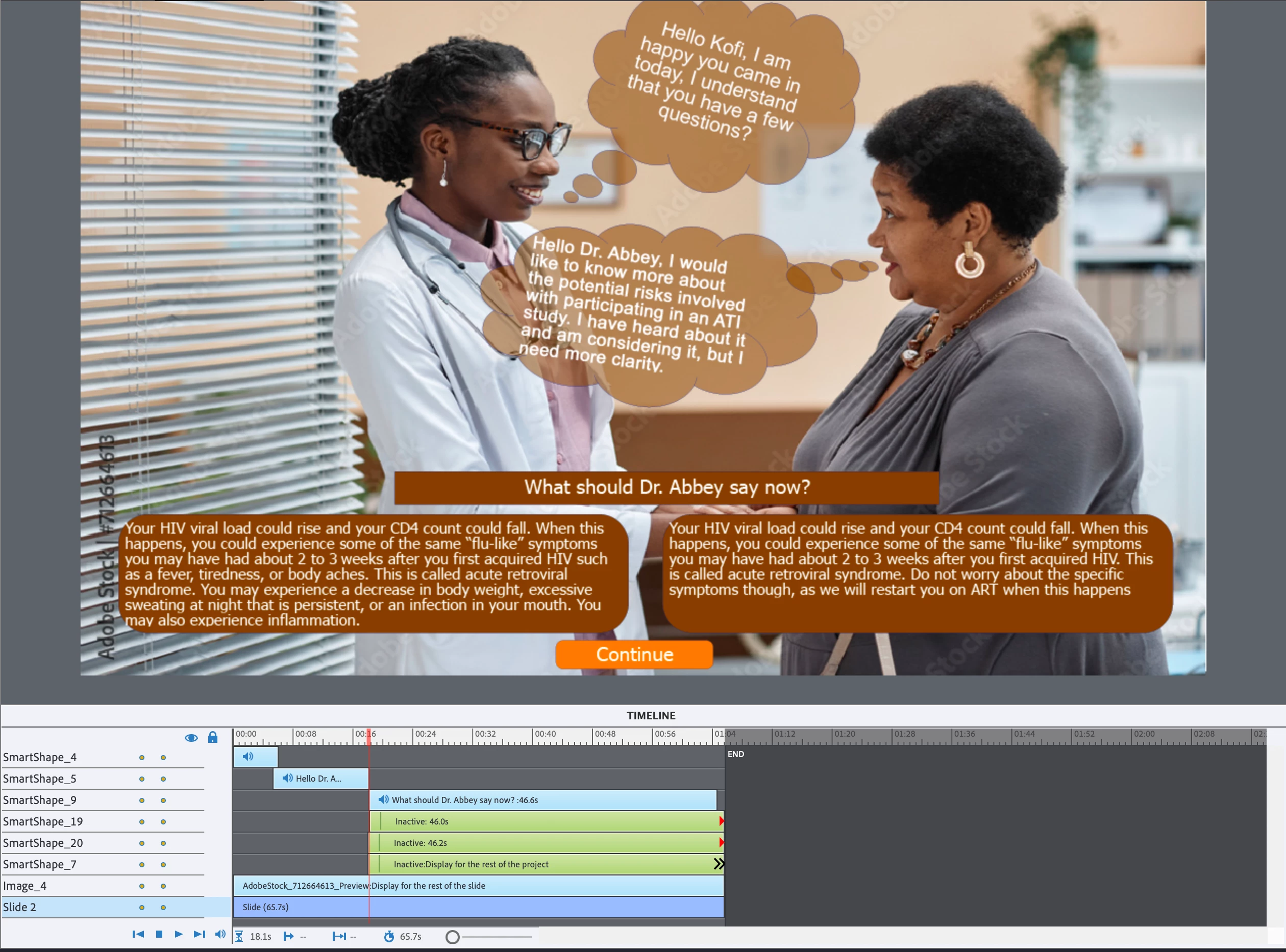I have the below slide and want to make the audio continue without the user interfering until we get to the question, but when I preview it, it stops after the first person speaks. Can this be fixed?