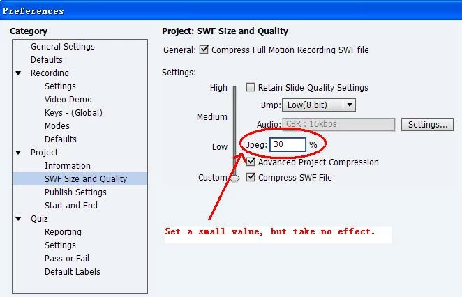 I have set a smaller Jpeg% value on SWF Size and Quality when publishing the project, but it take no effect, anyone help me? Thanks.