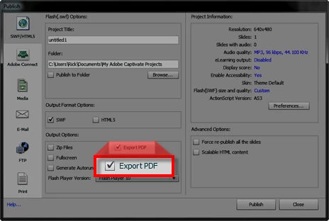 I'm using Captivate 6 and want to publish a small project to pdf so that a co-worker, without captivate, can view the project. How do I do this?