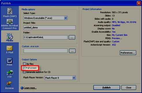 how to set my project as exe fullscreen projector and how to creat exit button