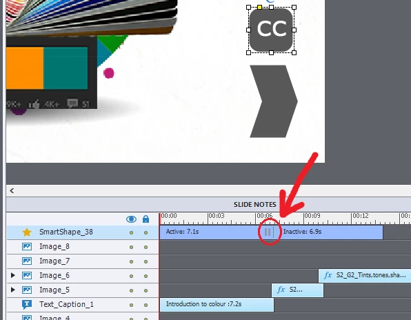 I see that you are using this shape button on a normal slide. Why not put it on the Main Master slide if you want it for the whole project? May I also point out that your shape button is pausing at about 7 seconds, preventing several images from appearing. The button will disappear at about 13,5seconds which means the user will no longer have the possibility to toggle CC? Extend its duration for the rest of the slide (CTRL-E).