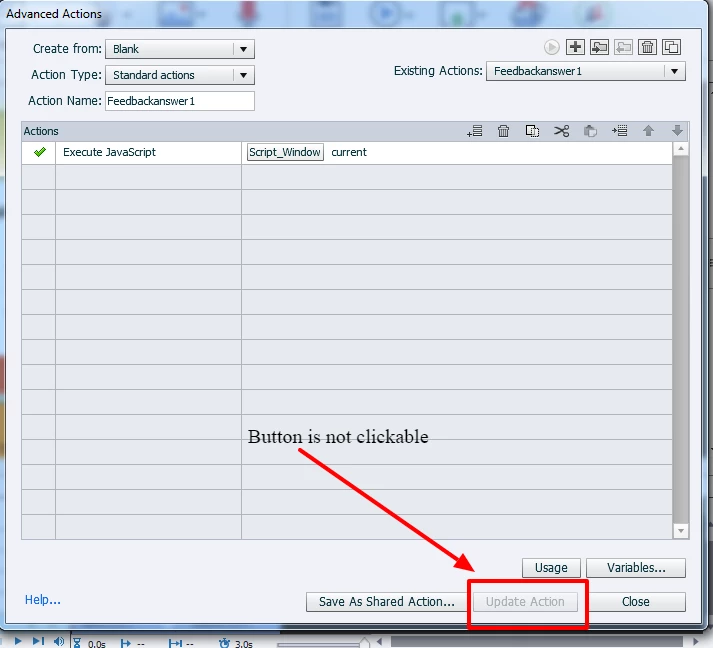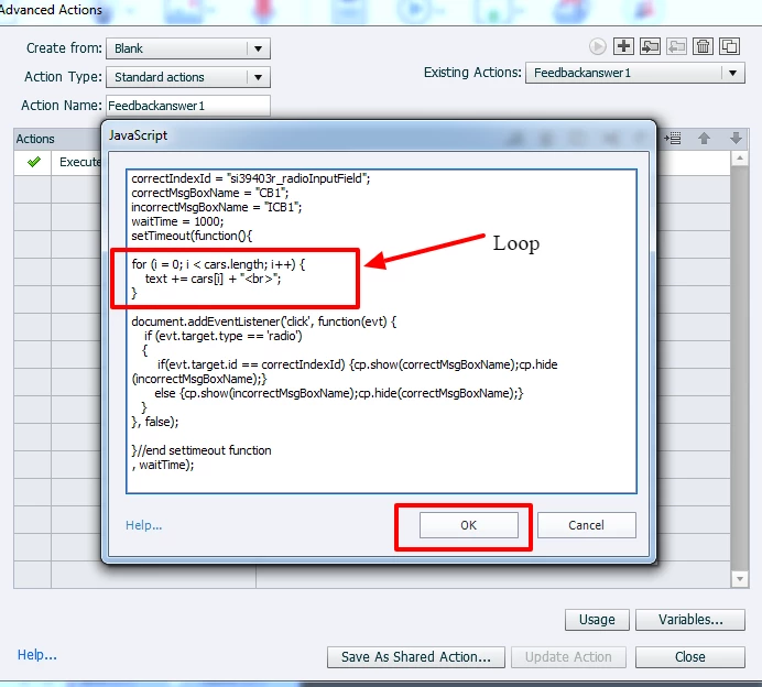I am trying to use loops in my JavaScript code in Adobe captivate 9, but when I click Ok button (after writing the script, it does not allow me to click on"Update Action" button. When I re-open script editor, loop syntax is erased aromatically by the tool.