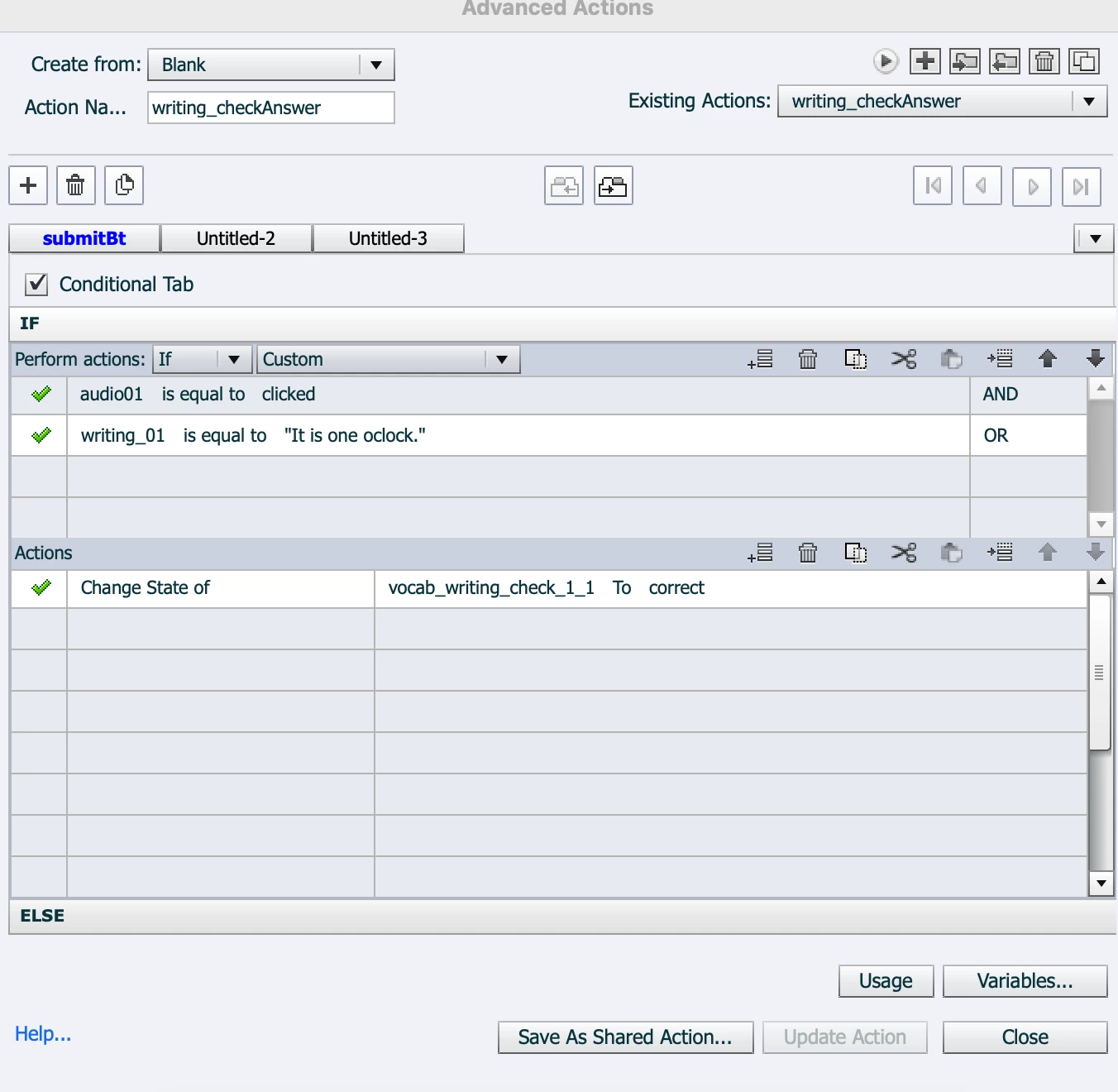 3. TEB has a variable declared (for example: writing_01 is equal to It is one o'clock)