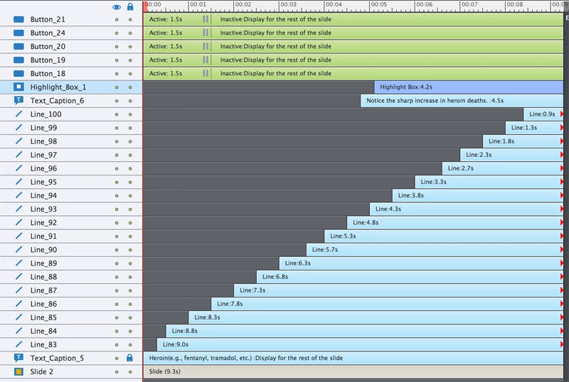 I'm using Captivate 9.0.0.223 (and Mac 10.12.06-Sierra) to create an animated graph with 5 screens. An intro screen and 4 other screens utilizing the "line" object to draw a graph line across the screen for each of 4 graphs. The output wanted is html5 only. Each screen has 4 buttons with a 'jump to slide...' action associated with each button (every slide has the same 4 buttons). In addition, each slide has a fade in textbox and a highlight box.