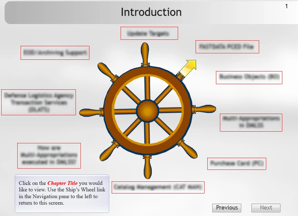 On the screen below, each red outlined area is a rollover slidelet. When the area is rolled over, the corresponding wheel is shown using a Shared Action. When clicked, the presentation jumps to the desired section of the lesson.