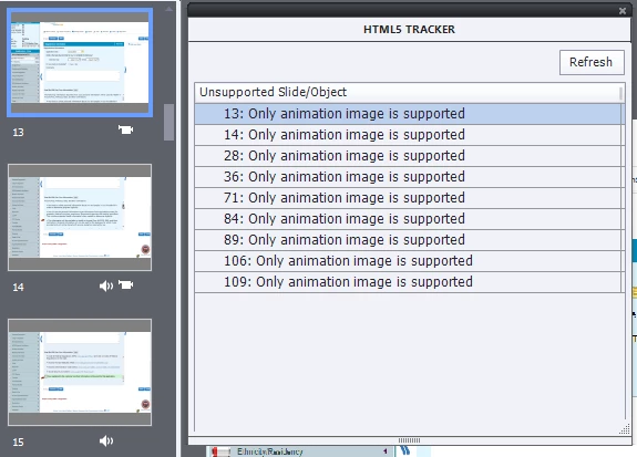 I am in the process of going through all of our Captivate modules and eliminating any non-HTML5 compliant elements. Several modules contain very long software simulations. On those simulations slides that have some sort of movement on them (i.e., scrolling down a screen), the HTML5 Tracker says, "Only animation image is supported." This indicates to me that these slides will present some kind of problem when published as HTML5. But I don't see any problems when I run the module in the SCORM cloud or when I preview as HTML5 in browser. The "animation images" seem to be working just fine.