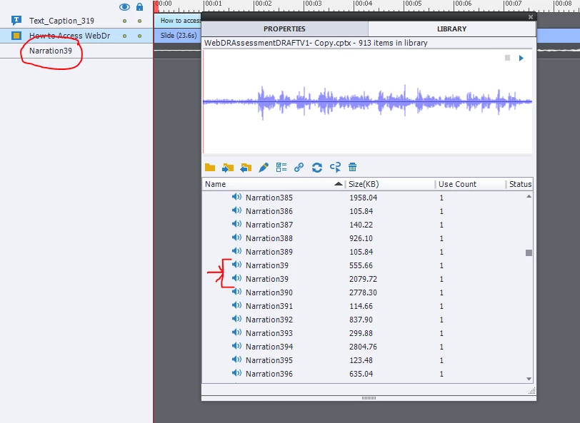 Recently I upgraded to Captivate 9 from 6, after having recorded slides in 6. When I went to edit I noticed that I had a duplicate audio file in the Library. Once I made sure I was editing the file I wanted, Audition added the term "clip" in front of it and the duplicate numbers disappears from the Library.