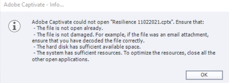 I had saved a project and then Captivate did the while not resonding thing. The next day I got this error: