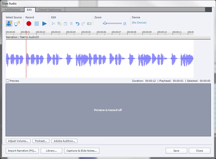 I think I might have just found a way. I selected Audio/Record/ then I selected Project Narration and Imported the Wave file I wanted on the CPVC.
