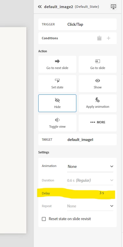 Currently, the delay option is available within action settings (see attached snapshot) for a few actions such as Show, Hide, Toggle, Apply Animation, and navigation actions like Go to Slide, Next Slide, Previous Slide, and Last Visited Slide.