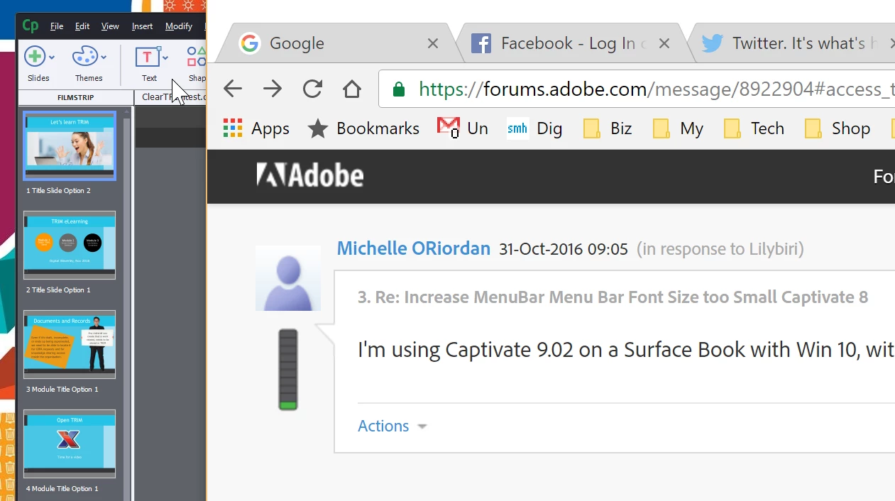 Problem is, every other app resizes. It's only Captivate which can't respond to a high DPI - scaling will affect all those apps that don't need help. Look at the difference between Captivate and Chrome. Come on Adobe!