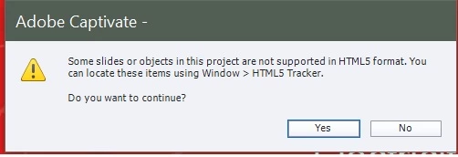 Also, I am noticing some of the features like text animation and effects such as glow or zoom in for drag-drop object not working, when I am previewing in HTML5 browser and publishing as HTML5/SWF. But I can view the effects when previewing in browser. The captivate pops up with the below screen when I try to preview the slides with these effects in HTML5 browser: