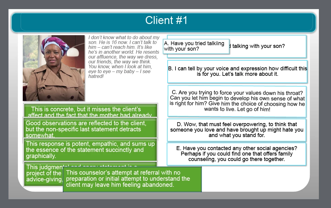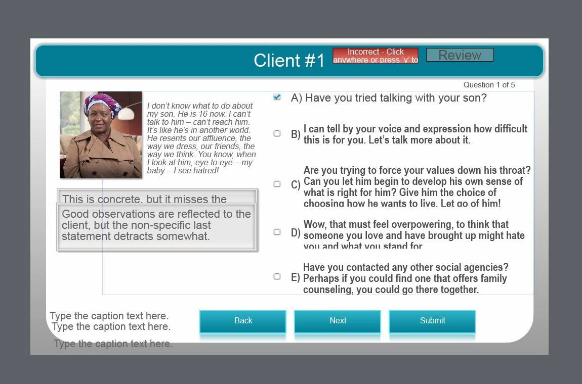 The screen below shows a picture of the client, a transcript of what she said, and five possible responses. Feedback for two of the responses are shown, although they are stacked so you can only read one. They will all be hidden until a response is clicked. (The caption text boxes at the bottom and the feedback boxes at the top are not being used at this point.) Feedback should appear when the user clicks one of the possible responses and then clicks Submit (although I would be happy to let the Submit button go if that is possible). Clicking the feedback box hides it again. The user is free to click each response and close its feedback box multiple times. There is no "right" or "wrong" here, and it isn't a quiz.