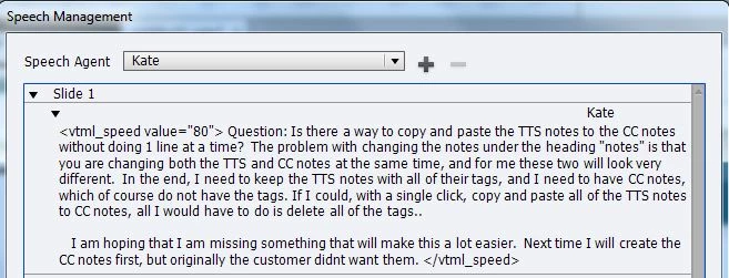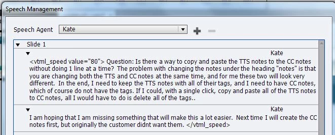 My project has TTS notes that are marked up with VTML tags.  (For every line, I have at least 2 VTML tags to slow the speed of the spoken text because there is no way to change the spoken-text speed of the entire slide at once, let alone the entire project... : (   For this issue alone, I am looking at switching to Storyline.)   Anyway, I also have CC notes, which are essentially identical to the TTS notes, but minus the tags.