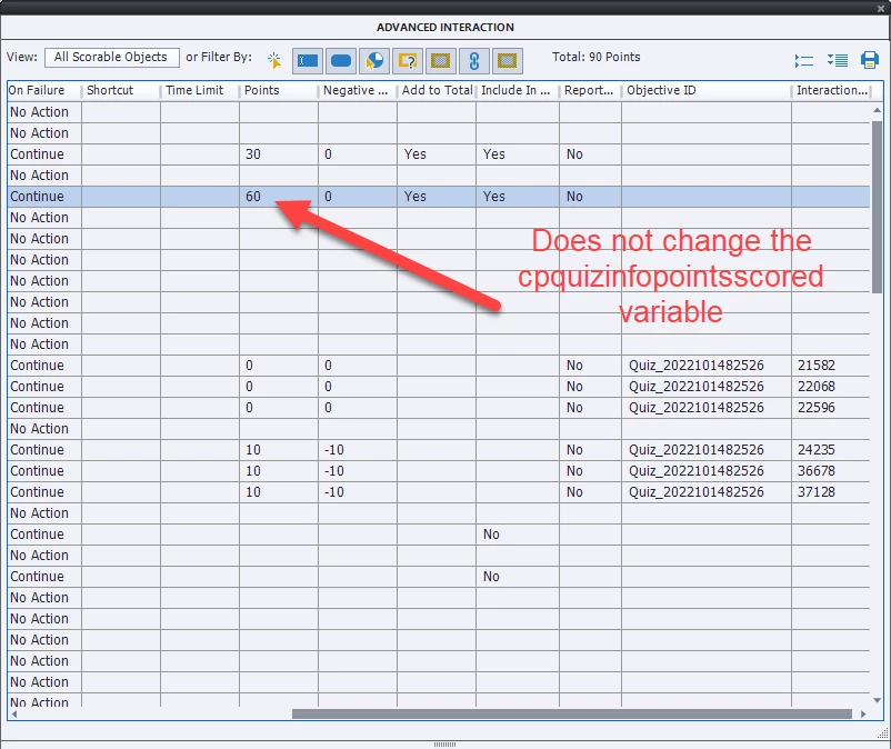 I tried creating a click box on the opening slide, set it as "Add to quiz" and "add to total" with the value set to 60, but it doesn't affect the pointsscored variable at all. (See image)