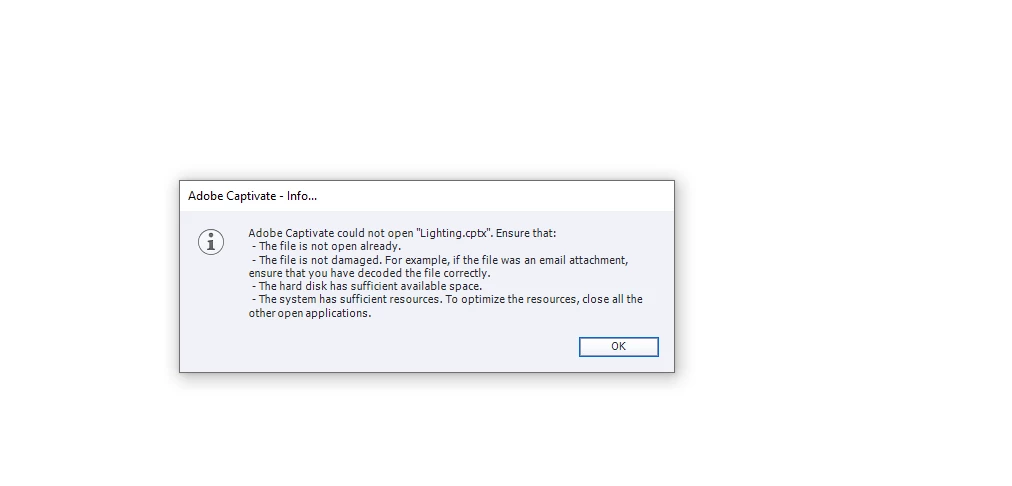 Issue in opening captivate file