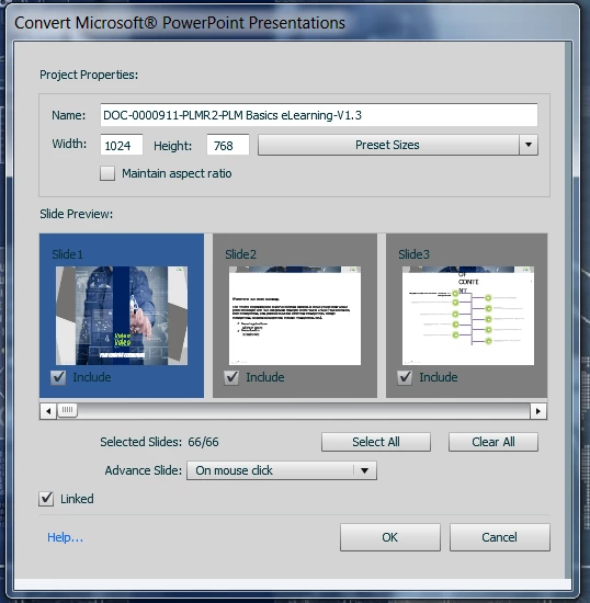 2-) I import a PPT with options: Linked, and Advance slides on click mouse