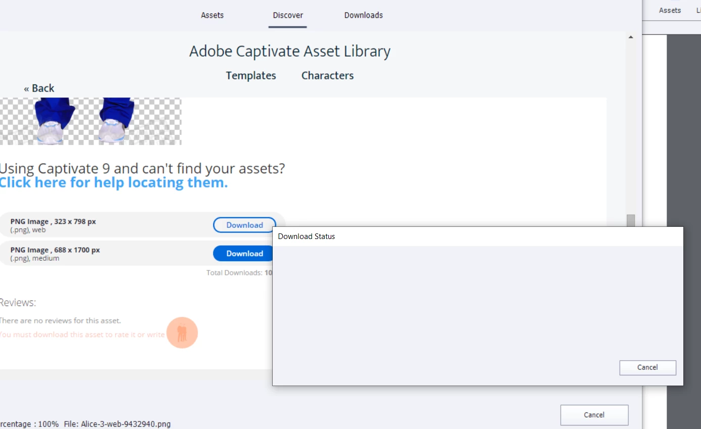 I have just downloaded the trial version and wanted to used some of the additional characters under Assets, Charaters, Discover. I go there, and can browse characters, but if I click download, a screen about download progress comes up that has no progress bar or buttons and nothing happens--see screenshot below. I am on Windows. How can I download these characters? I can download the main set of characters from the Assets, Characters screen, it is just the ones under Discover that don't work. I tried exiting out and restarting Captivate.