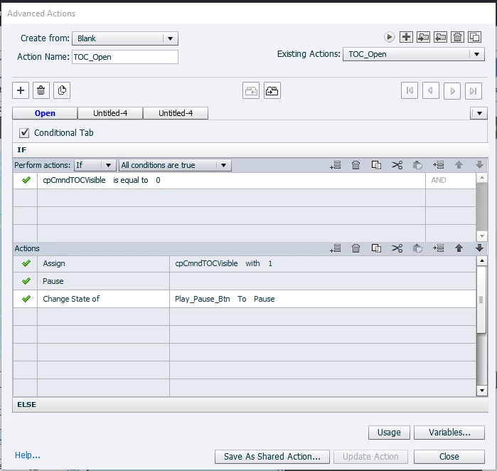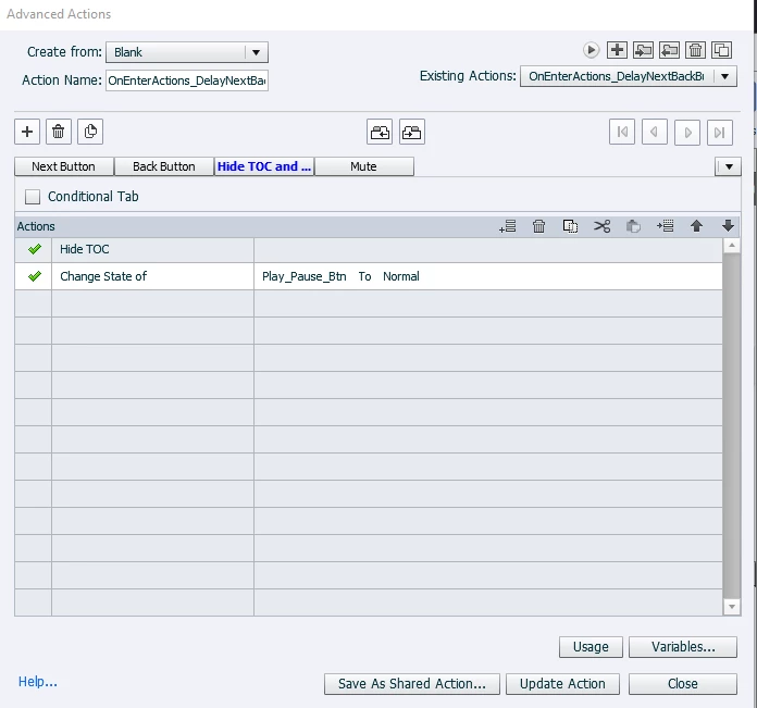 I need some assistance here. I have the built in TOC controlled by a custom button. When it's clicked on, it will pause the slide and the TOC will open up. The play/pause button will change to a pause state as well. This is perfect. When skipping to another section, the TOC will hide automatically with the Hide_TOC AA that I created, the play/pause button will switch to a play state, and the slide will automatically play. Also Perfect.