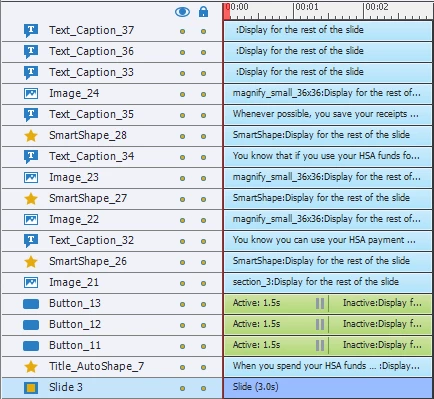Here is the timeline for the 3rd slide - each of these slides is expected to do the same thing and I'm duplicating the first slide (the one that works) and changing all variables to match the captions and smartshapes in each slide's advance actions.