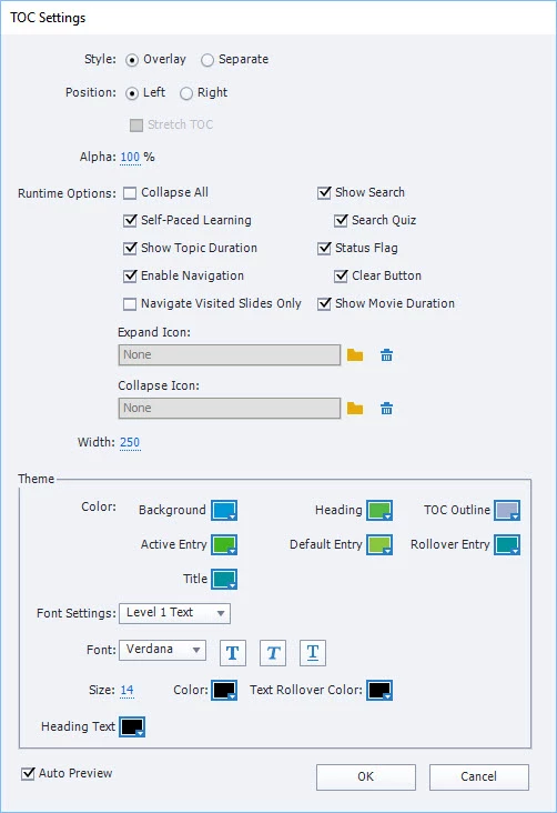 My issue is that when I preview in the browser, when I display the TOC, when I select a topic heading, the lesson won't navigate to the first slide in that topic. I have to choose the first slide within the topic. Is there a way to have the TOC jump to the first slide for any given topic? Here are the settings for the TOC.