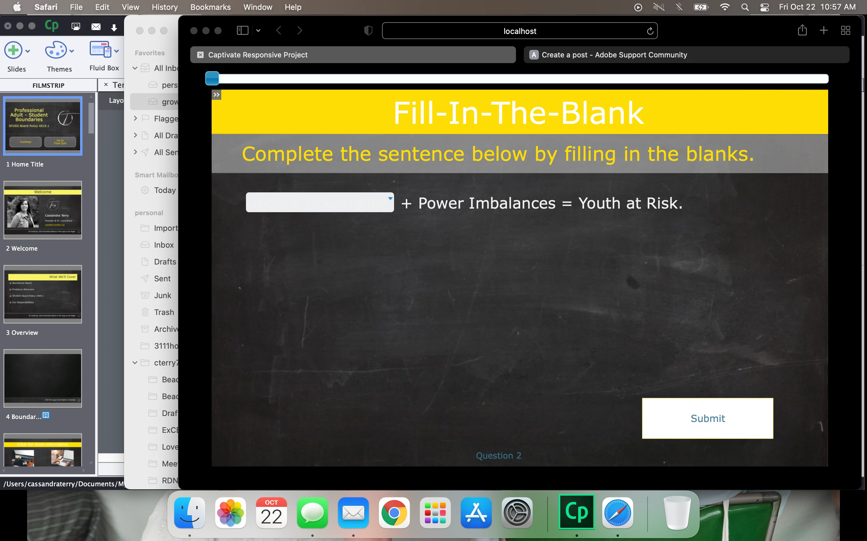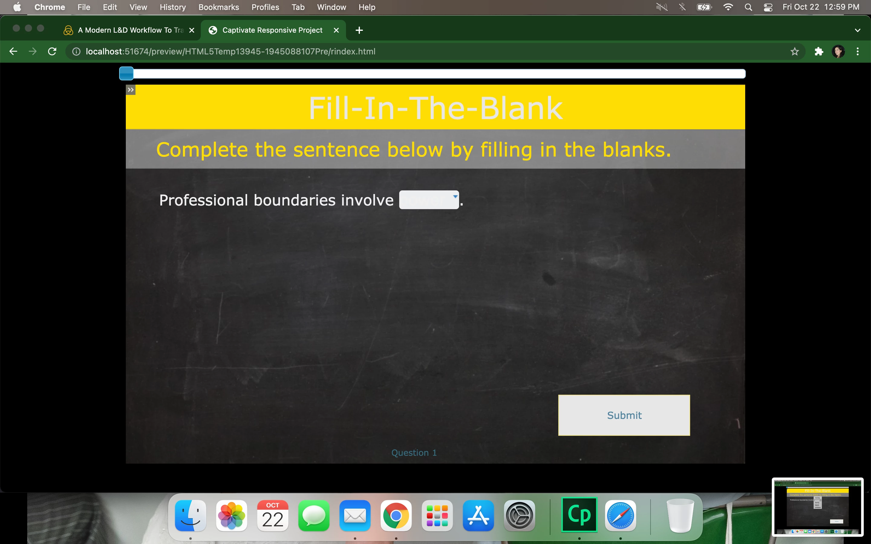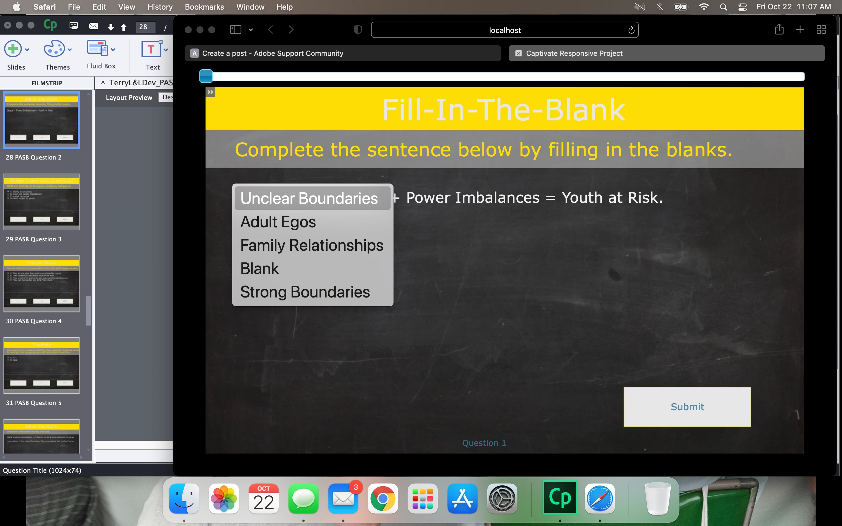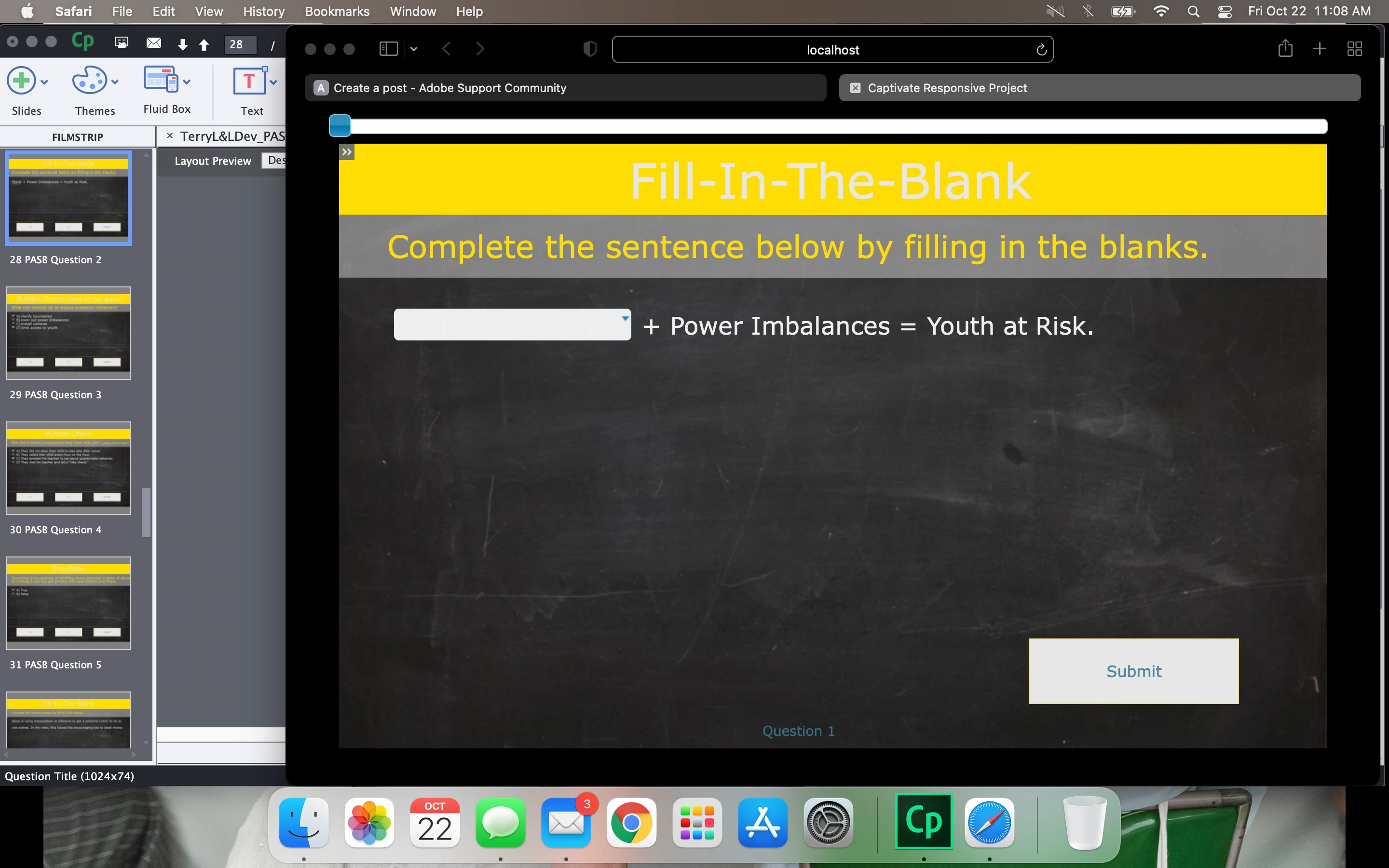 New Captivate user here. (I'm running Captivate 2019, v. 11.5.5.678) I have added in quiz questions and when previewing the question slides, I cannot see the difference before and after selecting an answer. I have changed my theme colors hoping that was the issue but nothing changed.