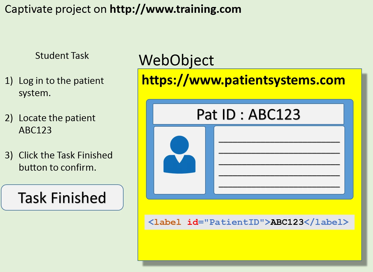 As a student task I need the student to browse the patients in the WebObject, and then click the Task Finished button on the slide.