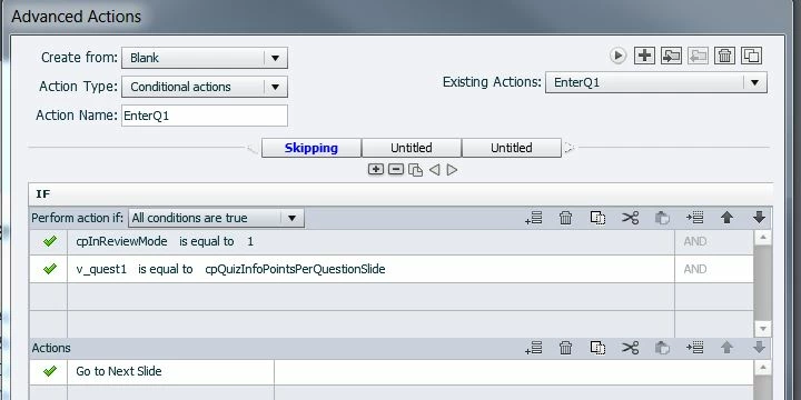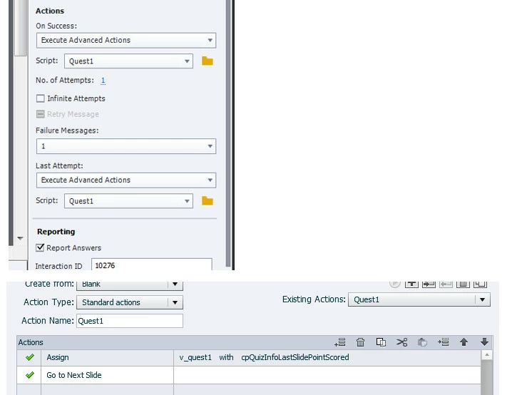 I am having issues in creating question slides and limiting review to only missed questions and would greatly appreciate any input. I have been following the Lieve Weymeis Captivate blog (Limit Review to Incorrect Answers (Captivate 6) - Captivate blog) on limiting review of incorrect answers and applying the Advanced actions and variables to question slides with Captivate 9 and I'm not having any success. It is something I missed and need some input. Below I will post my settings used for first question slide (question 1 of 4). All advanced actions and variable information can be viewed from blog mentioned above.