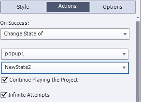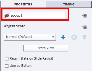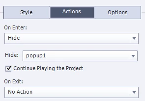 Up on clicking on Tab1 (button) we must show the object to reveal for example popup1. So, we have given an action to show the popup1. Like the tab1 you follow tab2 should show popup2 and tab3 to popup3.