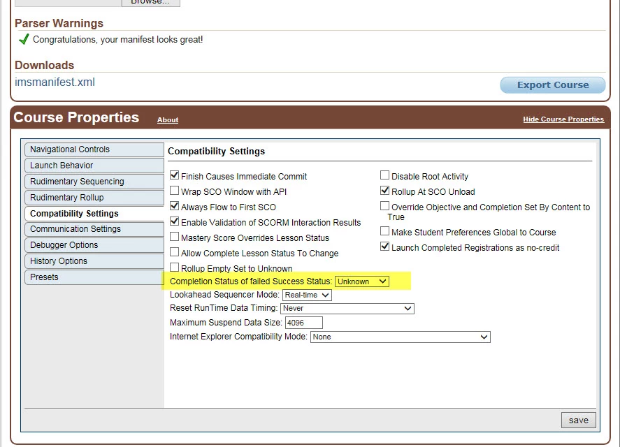 LoadMetadata (Manifest): LoadTechnical: Unsupported childNode found in Technical Metadata: pkgprop:ScormEnginePackageProperties