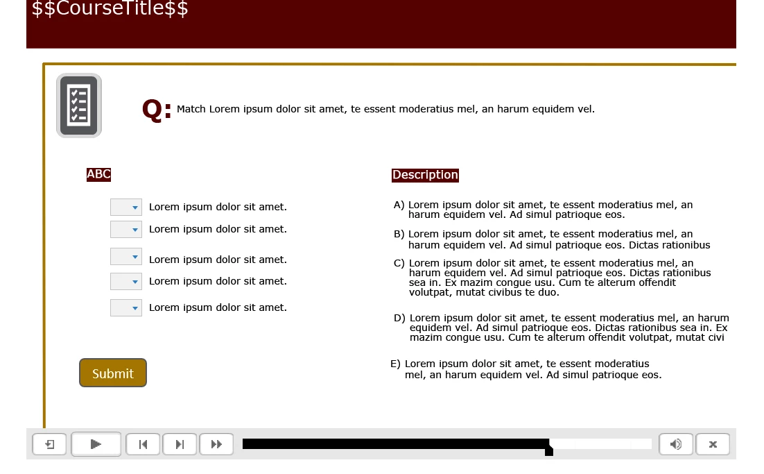 I am working on a course that includes mathcing slide quizzes, I have noticed that when the course is uploaded to the LMS (HTML Outpout) the drop down menu list is not in alignement with its title. Please see exmaple image below.