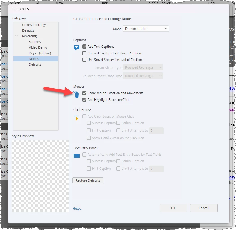 In Captivate 2019 I have recorded a software simulation and change the mouse cursor to double size and a custom blue click. I have published the file to html and loaded it on our LMS. The mouse does not show in the course. It also does not show in Preview mode. I have preferences set to Show Mouse Location and Movement.
